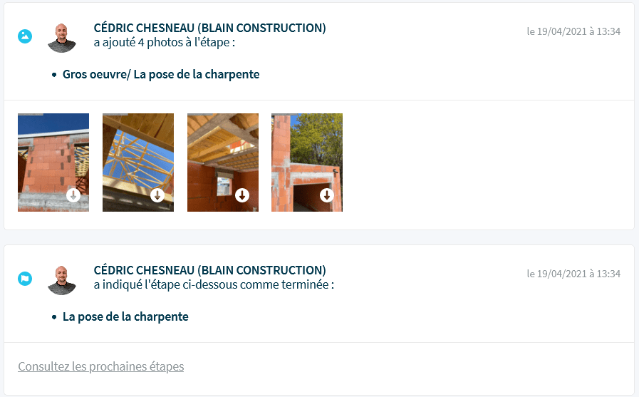 C’est ici que vous aurez une visibilité précise sur l’avancée de votre chantier. Toutes les étapes de votre construction de maison sont listées : celles déjà achevées sont en vert, celles restantes sont en bleu.